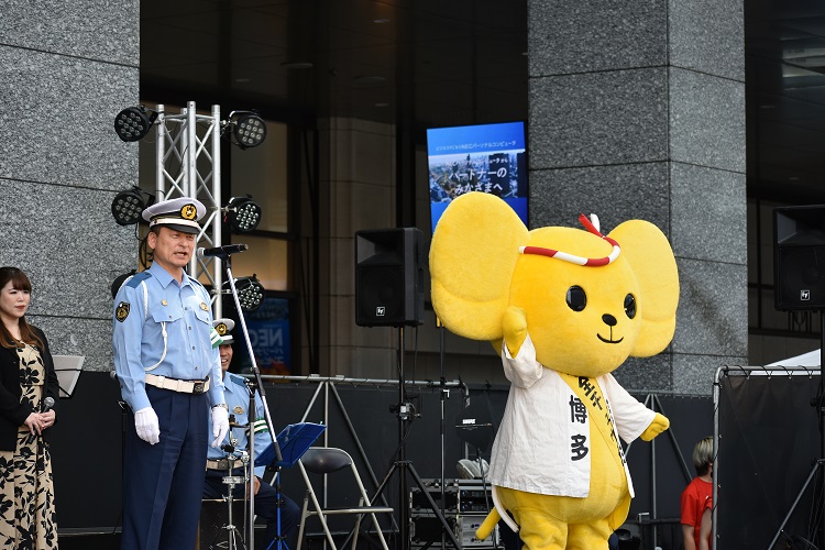 秋の交通安全運動は、内閣府が主唱し、交通ルールの遵守や正しい交通マナーの実践を広めることで、交通事故を防止することを目的とした全国的な運動です。私からも、博多交通安全協会のマスコットキャラクター「安全チュウ太」くんと一緒に、来場された多くの皆さまに向けて運動の趣旨をお伝えしました。