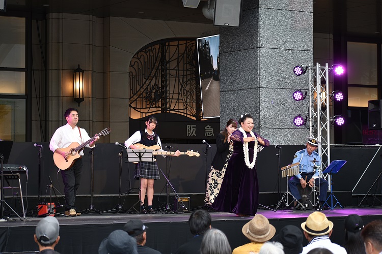 会場では、当署職員が参加する音楽バンド「Blue Bear Project」の演奏や、職員家族らによるフラダンスが披露され、他の出演者の演奏などと合わせて、音楽や踊りを通じて幅広い世代の方々に楽しく交通安全を考えていただける機会となりました。また、参加者の皆さまには「交通事故無し」にちなみ、福岡県産(うきは市)の梨などを啓発品として配布し、身近に交通安全を意識していただけるよう工夫しました。