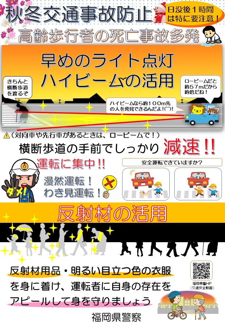横断歩道での事故が多発しています!自転車の一定の交通違反に青切符が導入されます交通死亡事故発生速報(令和7年9月26日発生)秋冬交通事故防止について交通指導取締り指針はこちら