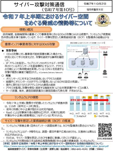 福岡県警察では、サイバー攻撃による被害の未然防止等のため、「サイバー攻撃対策隊」を設置し、サイバー攻撃に関する情報収集・分析、捜査及び実態解明を推進するとともに、重要インフラ事業者等と連携して、