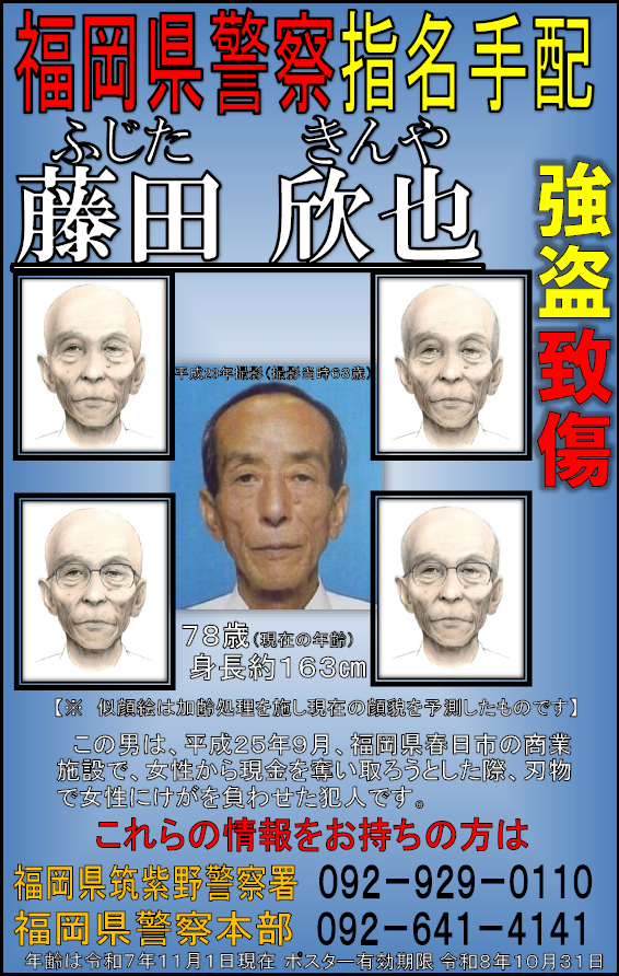 強盗致傷被疑者の検挙にご協力を!(藤田欣也)