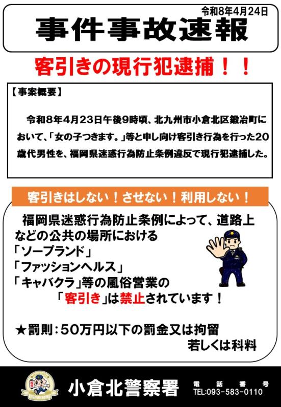 4月23日、北九州市小倉北区鍛治町において「客引き」を現行犯逮捕!!