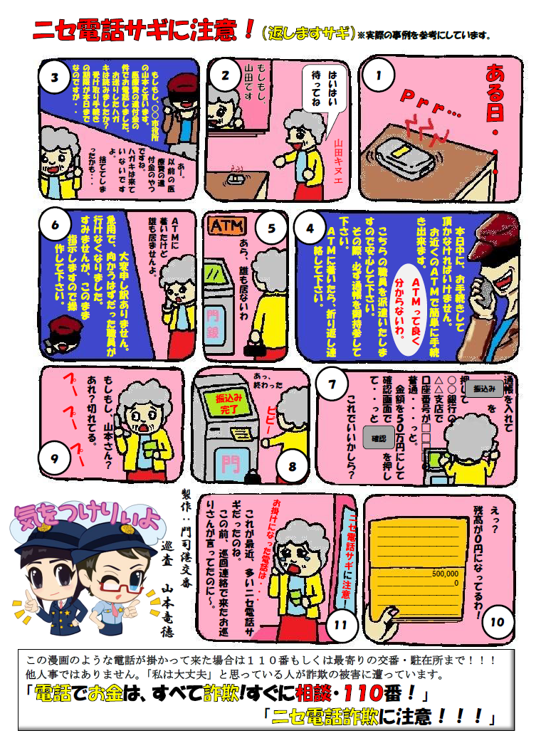 門司警察署 ニセ電話詐欺に注意!(返します詐欺)
