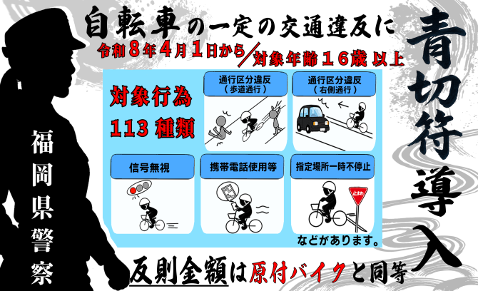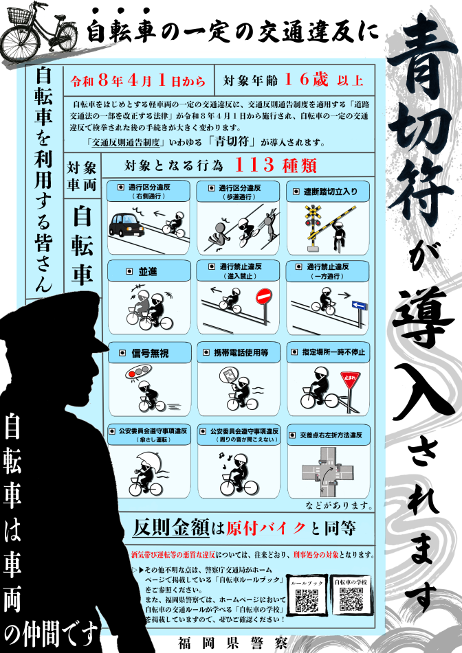 道路交通法の一部改正により、令和8年度4月1日から、自転車の一定の交通違反に対して、交通反則通告制度(いわゆる青切符)が導入されます! 詳細な内容については、チラシの右下二次元コードから警察庁交通局がHPに掲載している自転車ルールブックをご確認下さい。