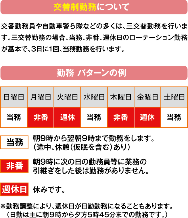 24時間体制で、管内の事件・事故に即応して任務に当たるとともに、パトロールや職務質問などの様々な活動を通じて地域の安全・安心を守る、正に「警察活動の原点」です。