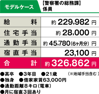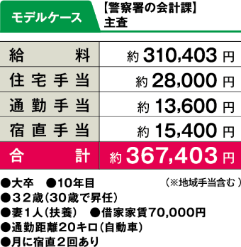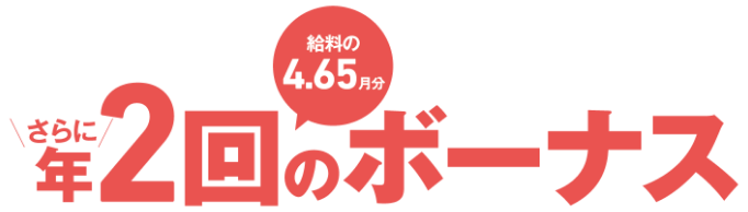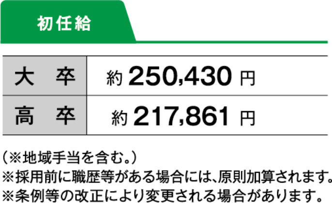 各種手当で生活をサポート 給与は、初任給に諸手当を加算して支給されます。諸手当には扶養手当、通勤手当、住居手当や超過勤務手当、宿日直手当、職務に応じた特殊勤務手当などがあります。このほか年1回の昇給があり、年2回のボーナス(計4.65月分)が支給されます。