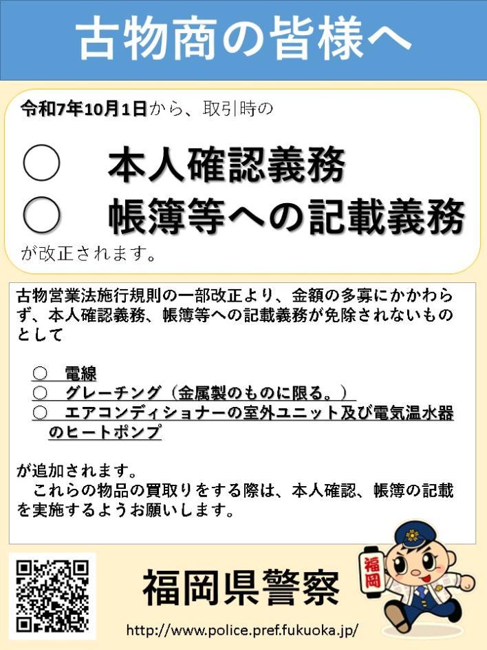 今回、古物営業法施行規則の一部を改正する規則(令和7年国家公安委員会規則第14号)が、令和7年10月1日より施行されます。